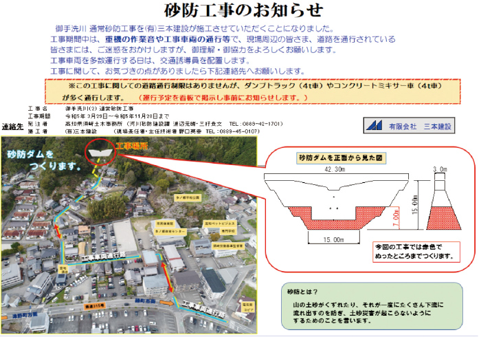 - 砂防工事のお知らせを市道運行経路沿い民家及び集合住宅の全世帯、須崎くろしお病院に配布した。現場近隣の民家は戸別訪問を実施した。