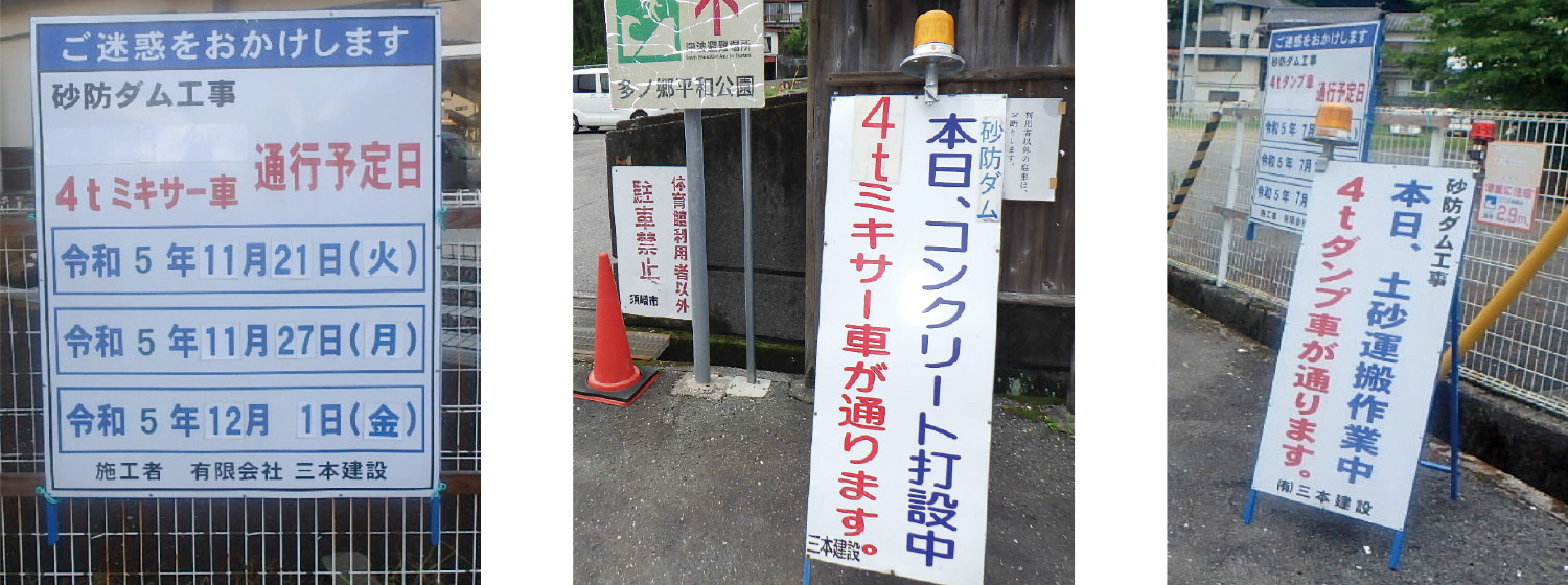- 通行予定日看板を設置し、4tダンプ車及び4tミキサー車の通行日の予告を行った。