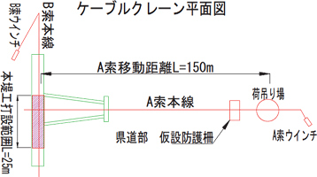 本堤上空でA索B索のケーブルが交際する。ケーブル本線の緩みにより輸送時バケット同士が接触しバケットが落下する恐れがある。(またA索と県道仮設防護柵との 交点も接触の危険)