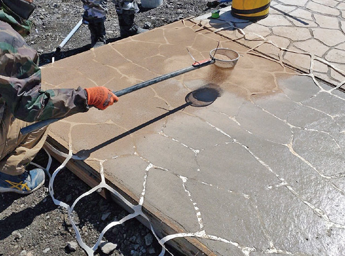 この工法は、はじめに、コンクリートを打設し、表面を木鏝(きごて)で平滑に均します。その上に自然配慮型の型枠(ステンシルシート)を載せてもう一度均したら、当初設計と同じ色あいの色粉を散布し、コンクリートによくなじませます。あとは、1 週間ほどの養生を行ったあとに表面を清掃し完成です。施工も簡単で自社で行うことが可能で、施工計画、管理も容易なため、コスト縮減も図られ、無事に完成する事ができました。