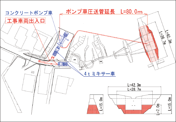 今回工事の生コン打設量はV=922m3、掘削土搬出量V=3600m3、全て4t車での運搬となる。