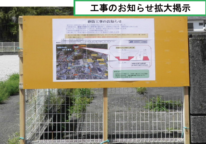 - 市道沿いの目立つ場所に工事のお知らせの拡大掲示を行った。