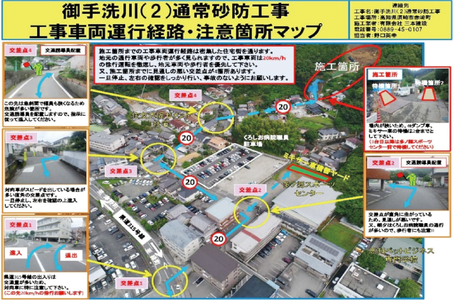 - 砂防工事のお知らせを市道運行経路沿い民家及び集合住宅の全世帯、須崎くろしお病院に配布した。現場近隣の民家は戸別訪問を実施した。