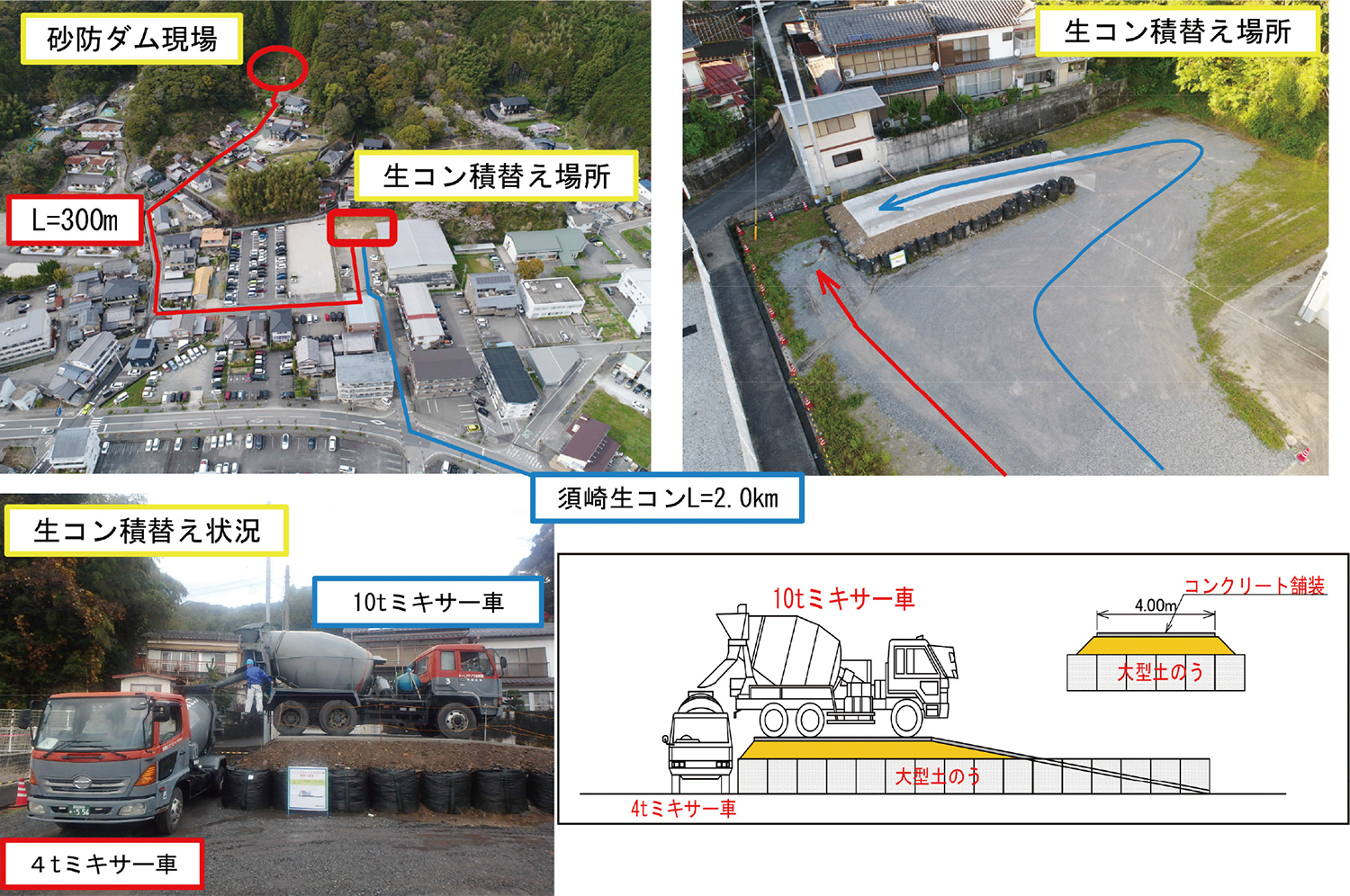 - 生コン会社にも事前に現地に来てもらい、注意箇所マップを使って安全運転を徹底した。すれ違い待機場所の確認も行いスムーズな運行を実践した。